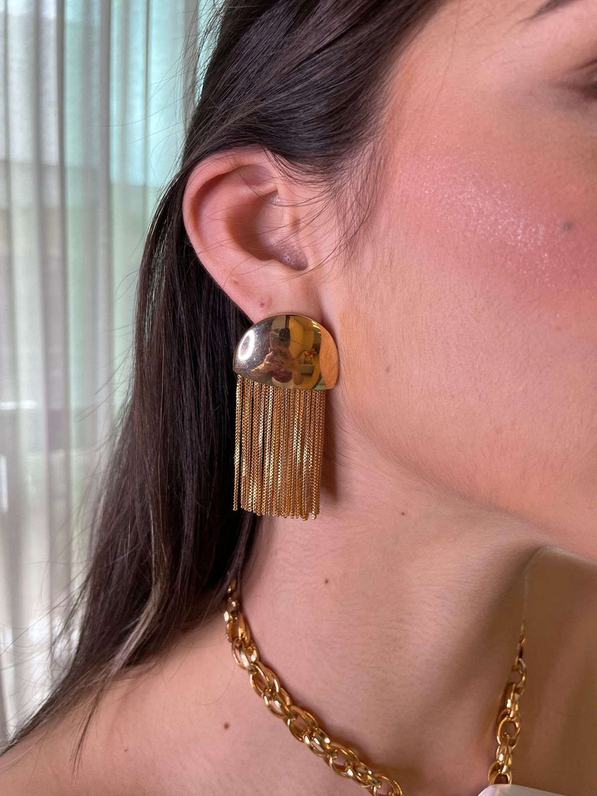 Brinco de franja, com base meia lua laminada.