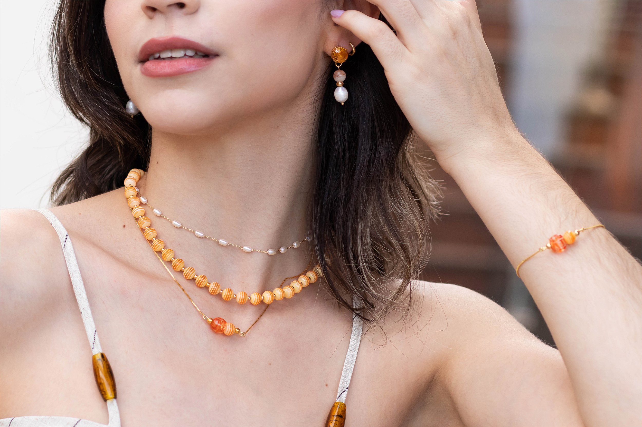 Brinco com pedras lapidadas, rolada e com pérola barroca.